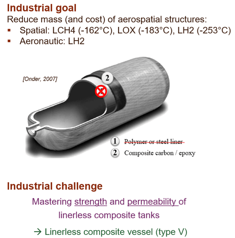 AMESDEP proposes a multi-scale approach to study the impact of manufacturing-induced draping defects on the thermomechanical damage and permeability of thermoplastic composites intended for liquid hydrogen storage. This issue is critical for cryogenic tanks, where removing the liner requires precise control of composite permeability.